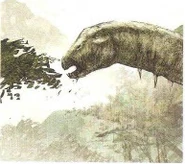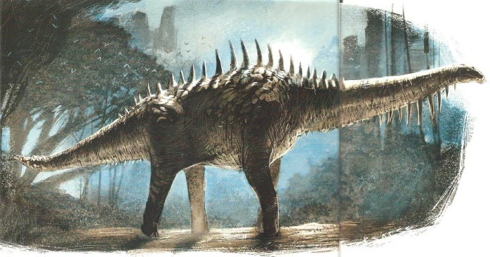 Second only to Brontosaurus in size are the giant Asperdorsus, narrow-bodied, long-necked, armored, spiked diplodocoid sauropods of the deep jungles of Skull Island. Although 'giant' in only relative terms as at 12.8 meters long, it is remarkable diminutive for sauropod standards. Cousins of the more heavily built Brontosaurus, they are tall and limber-necked. Sticking to the thick, wooded regions, Asperdorsus are browsers of midlevel foliage that is out of reach for most other terrestrial plant-eaters of the jungle. Their narrow draft allows these giants to maneuver adeptly between the twisted and densely packed trees, despite their great size.