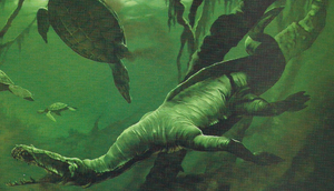 Turturcassis (meaning Turtle-helmet), is an 8-13 feet long (2.4-3.9 meters) plesiosaur-like predator.