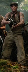 The man wore beige-like dark green clothing, wearing a cap, a pair of overalls, a tank top, and has several tattoos around his arms. He had a Thompson M1928 for protection, and often carried a boxy messenger bag.